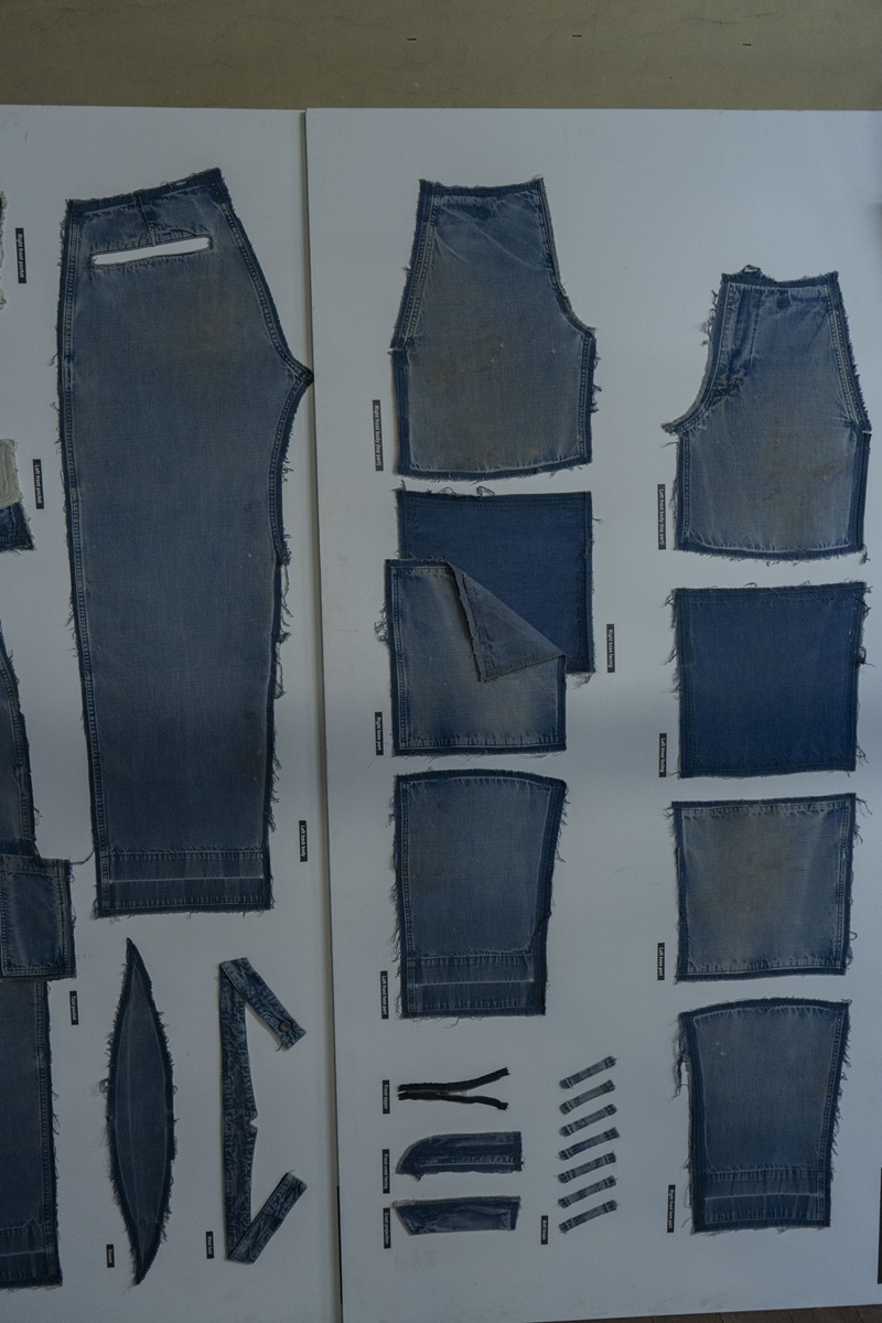廃棄して捨てられるワークウェアを分解、繋ぎ合わせ再構築した生地から、製品を作り販売する取組みをされています。
