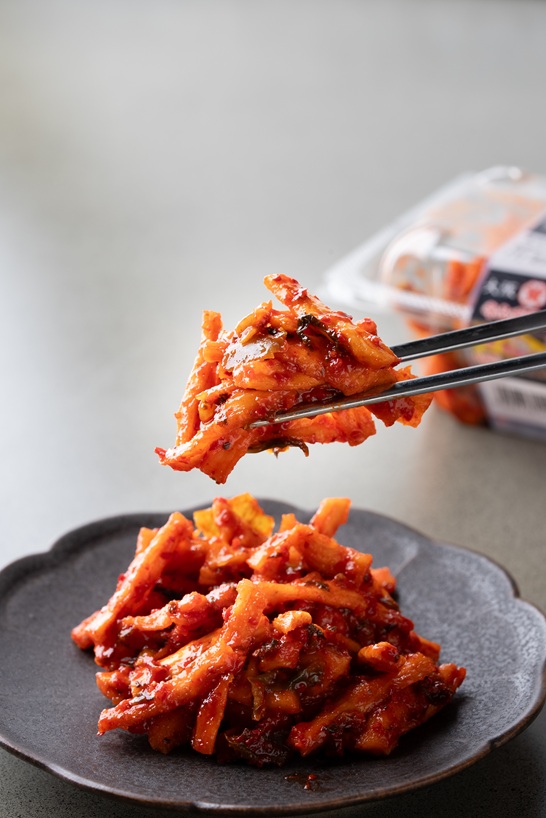 ポリポリ食感の割干大根キムチに梅の酸味としその風味をきかせてさっぱり風味のキムチにしました。