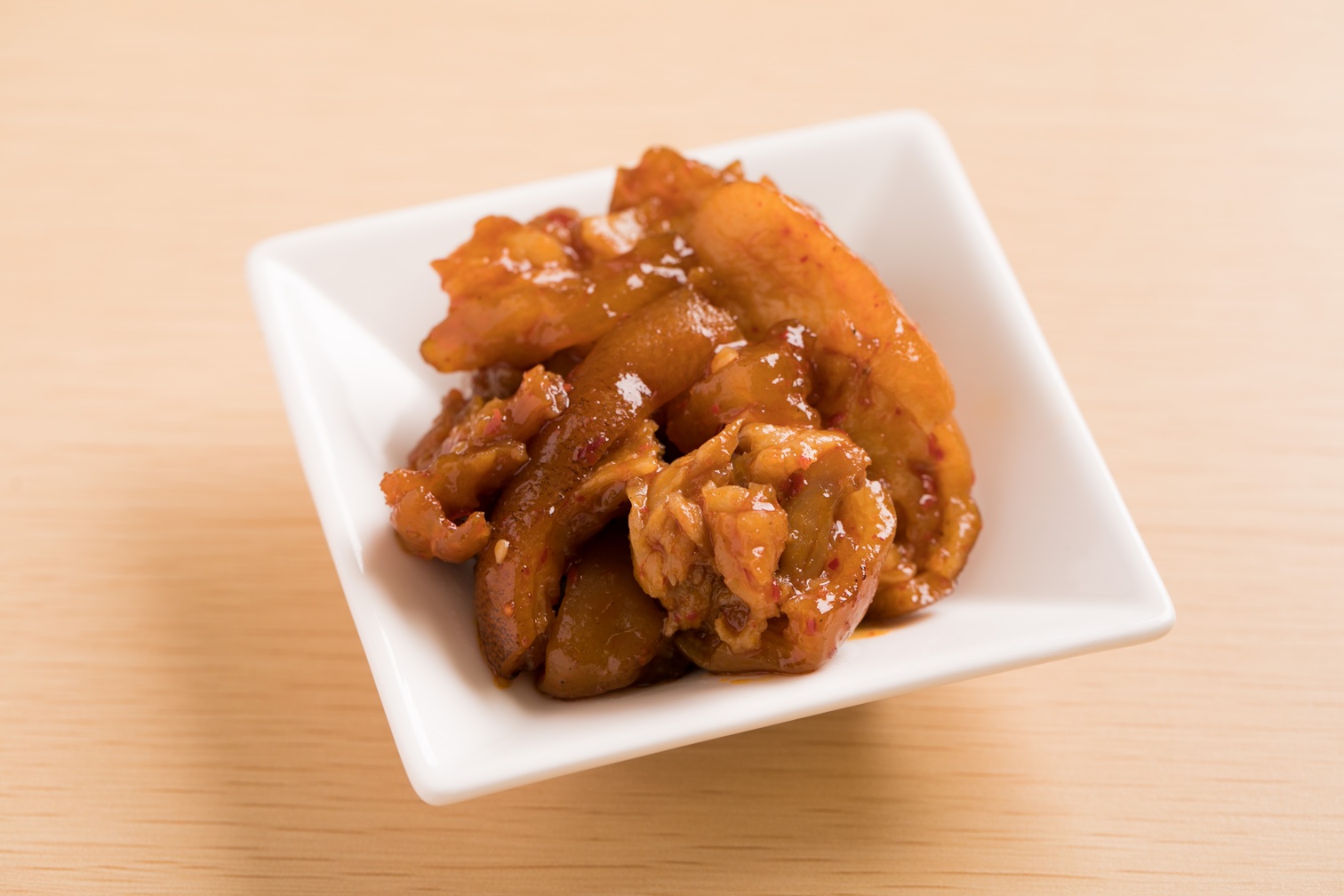 写真はヤンニョンと醤油などで炒めた「豚足のピリ辛ポッカ」です。
