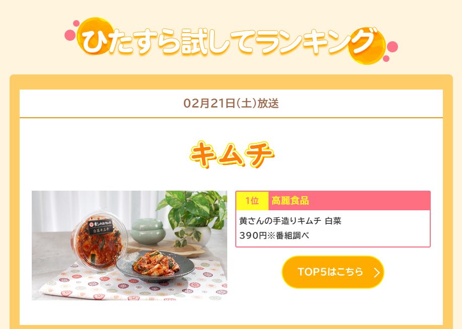 放送を見られた方は知っていると思いますが、見事当社の「黄さんの白菜キムチ」が総合ランキング1位を獲得いたしました!!