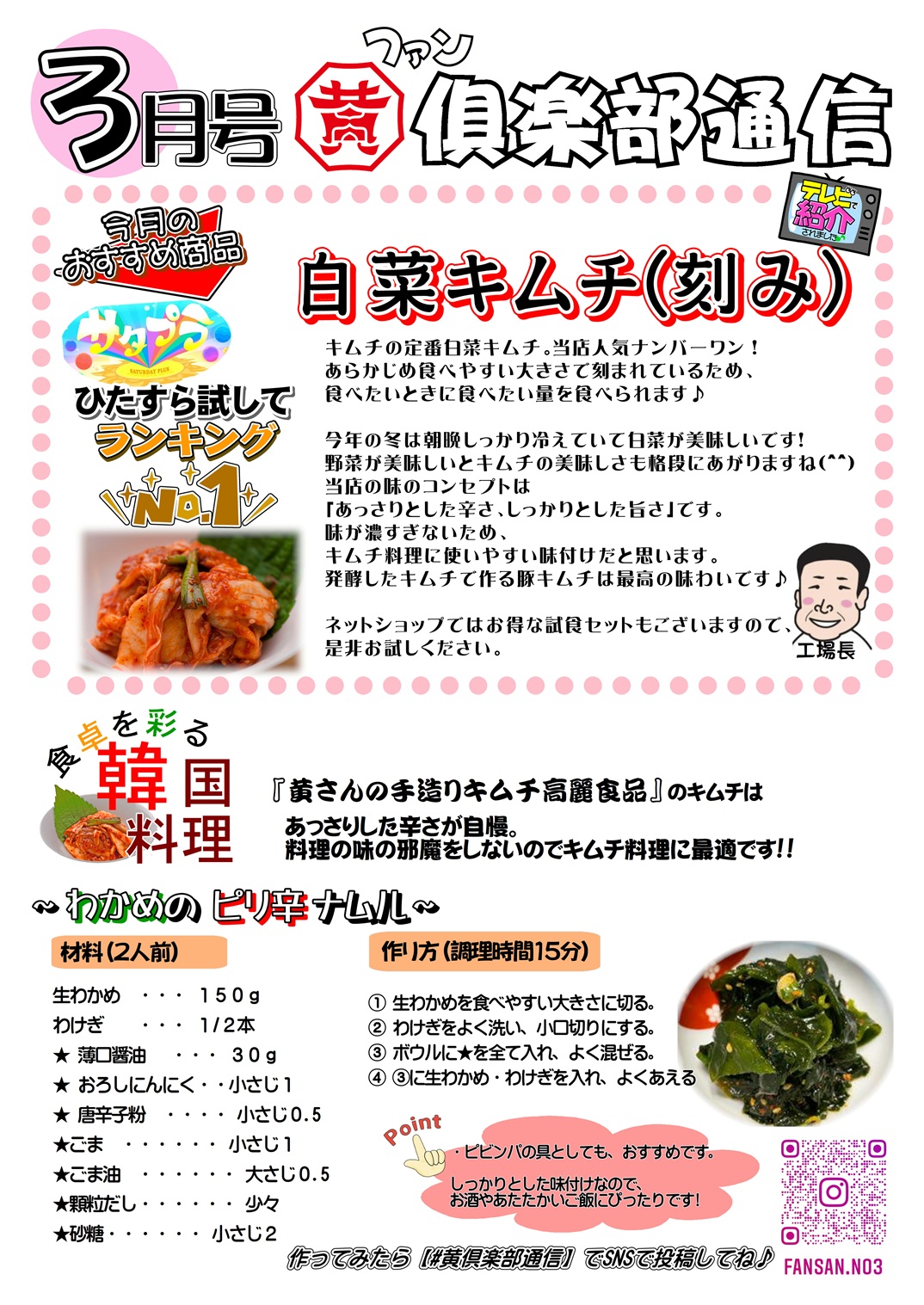 レシピはこちら → 大阪鶴橋黄さんの手造りキムチ わかめのピリ辛ナムルのレシピ