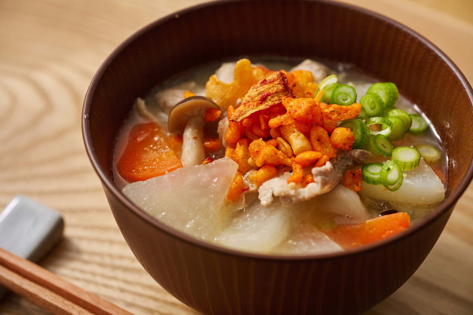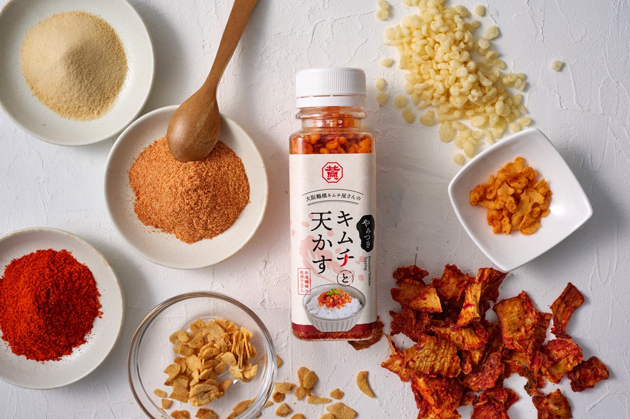 サクサクと軽やかな天かすに、最新技術で旨味を閉じ込めた「本場の乾燥キムチ」を黄金比でブレンドしています。